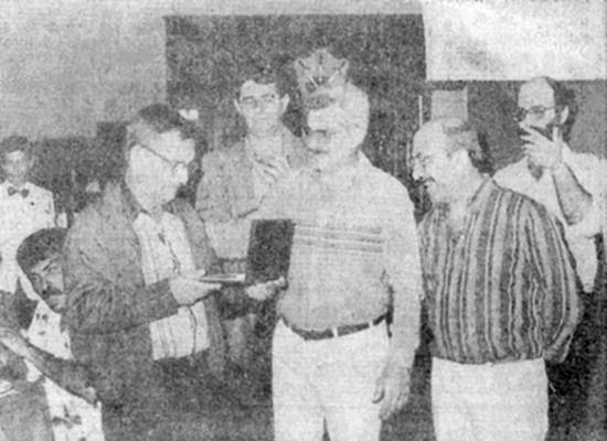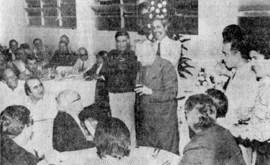 contando como antigamente era mais fácil ganhar dinheiro Foto publicada com a matéria Oito histórias - Charles Edwards contou diversos casos de sua vida, que representa em parte a própria evolução da representatividade dos agentes de navegação santistas através de entidades especializadas: "Comecei em 27 de julho de 1927 e me aposentei após 49 anos de função, na Dickinson. Tivemos muita luta, principalmente na época antes da revolução (de 1964). As greves eram constantes, inclusive havia aquela organização que abrangia todos os sindicatos (o Fórum Sindical), parava-se o porto de Santos por completo". "Numa dessas greves, tinha um vapor no porto, e nele uma senhora doente precisava de remédio, e nas farmácias não era encontrado, foi difícil conseguí-lo". "O Centro de Navegação Transatlântica de Santos foi o primeiro que conseguiu sua sede própria, levamos dois anos para comprá-la, com muita luta e sacrifício. Era um centro muito ativo e agressivo, lutou muitos anos e, com a ajuda do dr. Neiva e do dr. Boulhosa (assessores jurídicos), conseguiu alguns resultados favoráveis que nem o Rio de Janeiro conseguiu". "O projeto 850 foi o mais batalhado - dava o direito de entidade estivadora para os sindicatos. Fomos contra o projeto, tivemos reunião com o então governador de São Paulo, Carvalho Pinto, com o presidente do Supremo Tribunal Federal, com Tancredo Neves, e vendo a possibilidade das agências perderem esse direito, fundamos com grande sacrifício a Associação Profissional das Entidades Estivadoras de Santos (Apees)". Charles Edwards recordou também o trabalho de Jorge Figueiredo, primeiro presidente da Apees, e acrescentou: "Fundamos o nosso sindicato, e conseguimos também da Apees a questão dos limites de contribuição, sendo o resto devolvido às agências. Após a revolução, passou-se um período de paz e sossego, não houve mais tumultos, paralisações. Tenho notado entretanto que algumas das reivindicações dos sindicatos estão voltando neste ano. Nossas exportações aumentaram, com navios sofisticados, requerendo mais técnica por parte da nova geração, à qual rendo meus parabéns". James Patrick Conway, com muito bom humor, começou: "Fugi do colégio aos 14 anos, porque meu pai havia falecido, e achei que devia ajudar minha mãe. Fui procurar um emprego, comecei atendendo telefone. O número do telefone era 174 (palpite para amanhã). Tinha uma coleção de selos e moedas que meu pai me deu. Trabalhando com um inglês, ele me deu uma máquina de escrever, aprendi a escrever à máquina. Fui convidado a ir para o LLoyd's Register, fazer certificados de vistoria. O inglês me dava 10, eu fazia 20. Aos 21 anos, fiquei chefe do Lloyd's, e fui encarregado de navegação. "Um belo dia, um grande amigo nosso, pai do Alex Grieg, pôs anúncio no jornal. Eu me candidatei, pedi para falar com ele. Era em 1937, e havia uma reunião no Centro de Navegação Transatlântica, em Santos, em cima do Café Carioca. Lá conheci o Grieg. Conclusão: fiquei secretário particular de Alex Grieg, o pai. Hoje estou felicíssimo, por rever velhos e novos amigos. "No porto, antes era tudo tão fácil, hoje é tudo tão difícil. Hoje se ganha um dinheiro suado, antigamente era mais fácil. Tenho pena de vocês: são uns sofredores". James Conway deixou a Grieg no início da década de 1960, formando a empresa Conway & Ashby, com Vernon Sharp Ashby, também saído da Grieg e hoje em agência marítima própria, além de Pedro Porto de Oliveira. Em 1978 se desligou, formando as empresas Miller Conway & Cia. Ltda., comissária de despachos, e Tradutec Traduções Técnicas e Comerciais S/C Ltda. Achiles Greca, nascido em São Paulo, e atualmente freqüentador do Clube de Pesca de Santos, conta ter começado na Delta Line em 1926. "Parei com os estudos à noite no Ginásio Santista. Permaneci na Delta Line até 1978, foram 52 anos só nessa empresa. Quando comecei, o nome da agência era America Steamship Line, passou para Delta Line mais ou menos em 1942/1943. A America Steamship Lines atendia como agência duas linhas: a America Republic Line, ou Linha do Atlântico, absorvida pela Monson Line, hoje Moore McCormack; e a Gulf Brazil River Plate Line, que se transformou em America Delta Line, cujo armador era America Steamship Line. A vida na navegação comercial nos proporciona as coisas mais extraordinárias, todos os dias. Me sinto muito honrado de estar presente nesta reunião, com vocês, jovens". Alberto Dias Rebouças começou na navegação em 1922, na cabotagem, na Modesto & Cia., passando em 1924 para a Delta Line, onde permaneceu, aposentando nessa empresa em 1977. O troféu do Clube do Leme foi o segundo que recebeu em sua vida: o primeiro foi no tamboréu, como conta. Convidado a falar na reunião, disse apenas: "Neste ambiente marítimo, não vejo ondas, dúvidas, nada. Apenas queria dizer que encontrei aqui velhos amigos, velhos companheiros de lutas, estou satisfeito, e espero continuar participando dessas festas. Aos novos, peço licença para contar que um gerente meu, quando encontrava alguma coisa errada, dizia: "A primeira coisa a fazer é consertar, para depois saber quem errou". Antonio Juliano fez de público apenas um agradecimento, mas depois contou ter começado em 1936, aposentando-se em abril de 1977, após mais de 40 anos de navegação. Começou, entretanto, na área de frutas da Fischer & Cia. Como falava inglês, foi em 1936 para a Delta Line, onde permaneceu até aposentar-se. Seu serviço era praticamente de cais, de tráfego, e como procurador - "o homem que trabalhava na sombra". "Estive nos EUA em 1966, no vapor Del Sud, numa viagem de 45 dias, visitando todos aqueles portos, e sendo sempre bem recebido, graças às amizades que havia feito. Nasci em 1911 na Itália, embora meus pais tenham casado no Brasil. Vim de lá com oito meses de idade. Durante a II Guerra, porém - e apesar de por coincidência ser italiano - nu